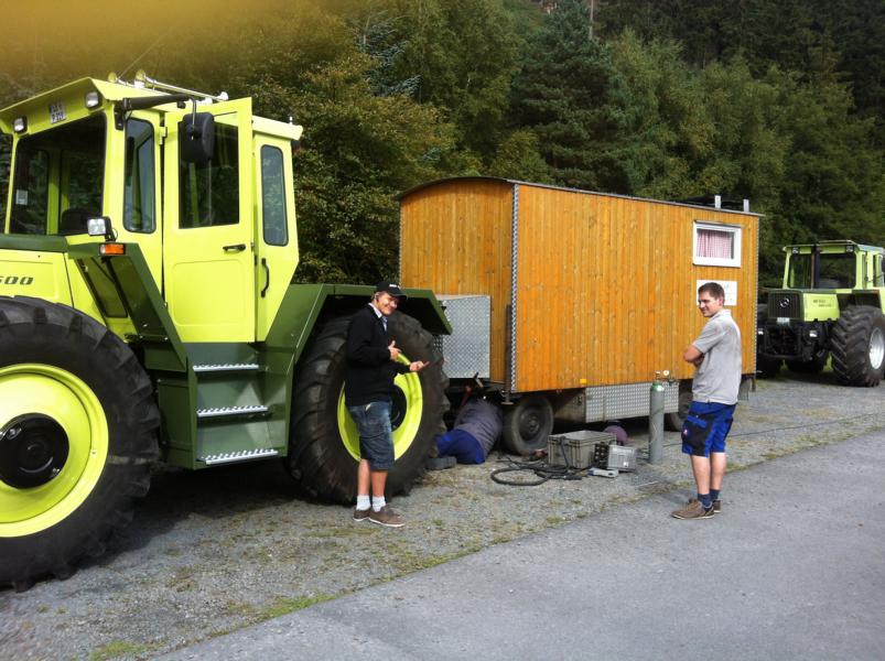 Auf unserer Erlebnisreise durch halb Deutschland wurden wir unterwegs nur von unserem Bauwagen aufgehalten. Die Deichsel wäre fast nur noch am Trac anstelle am Anhänger gewesen. Die Reperaturlösung vom "Schweißer vor Ort" hielt dann noch bis Nordhorn. Dort konnte die Deichsel dann "fachmännisch" von uns selbst bei einem örtlichen Landmaschinenhändler wieder angeschweißt werden...