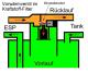 Die beiden Schlauchanschlüsse sind mit einem Richtungspfeil markiert und haben permanent Durchlass. Zieht man am Zugang Richtung Filter saugend Luft, kommt mit einigem Widerstand etwas durch. (In Gegenrichtung, also aus dem Zugang zum Filter heraus Richtung der beiden Schlauchanschlüsse fließt nichts, da ist völlige Sperrrichtung).